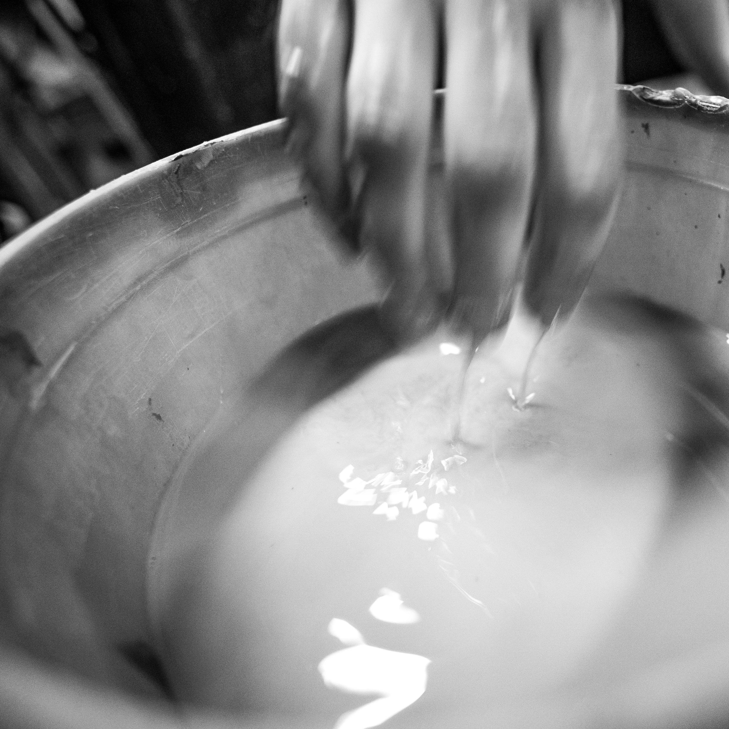 A person working with clay on a pottery wheel, with their hands covered in wet clay.