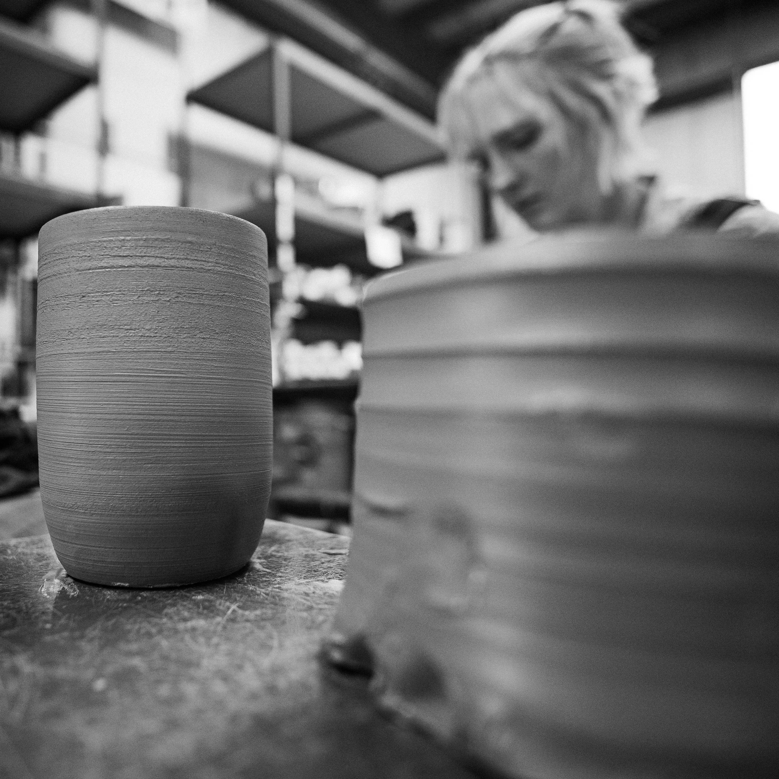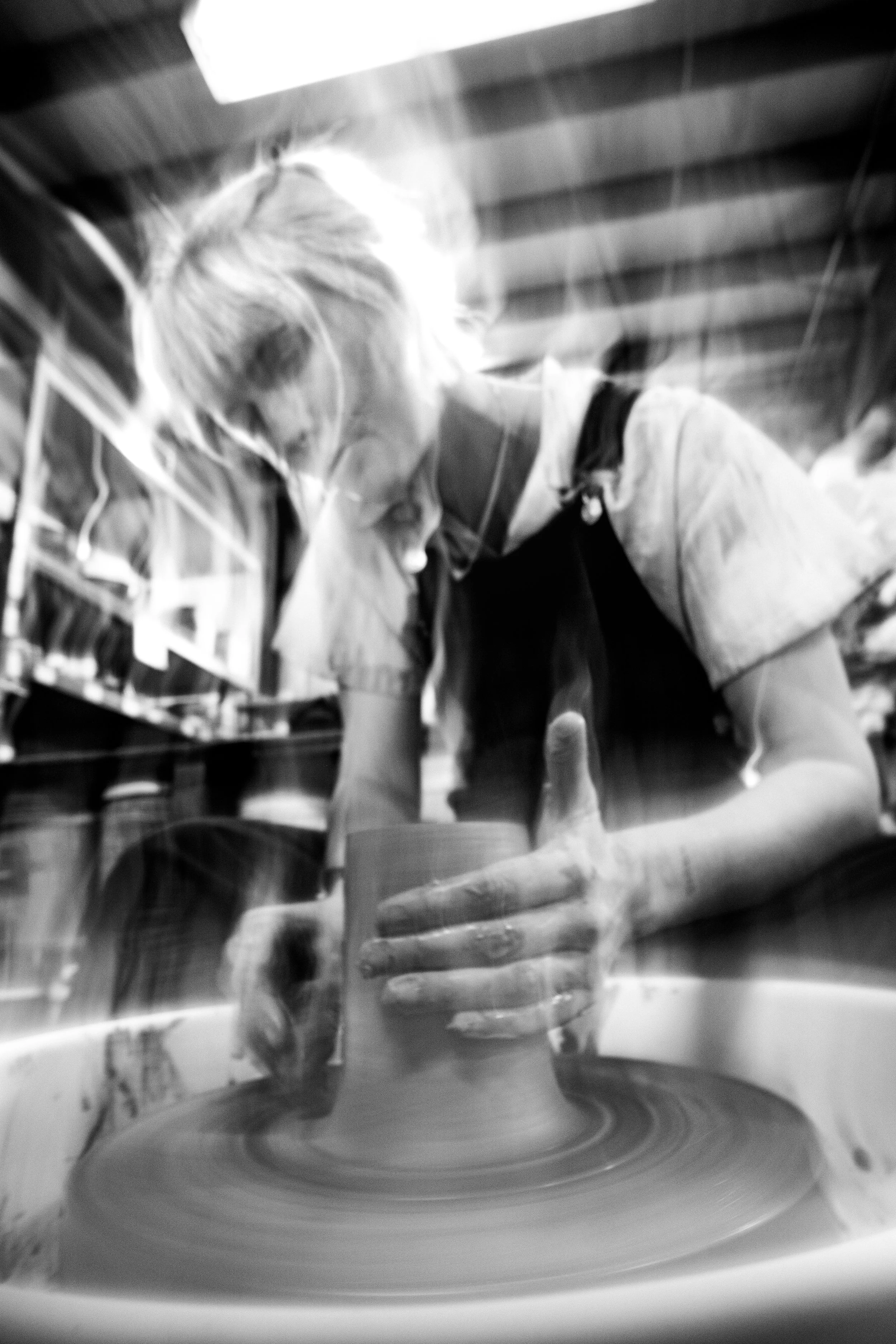 A person shaping clay on a pottery wheel in a studio, captured in black and white.