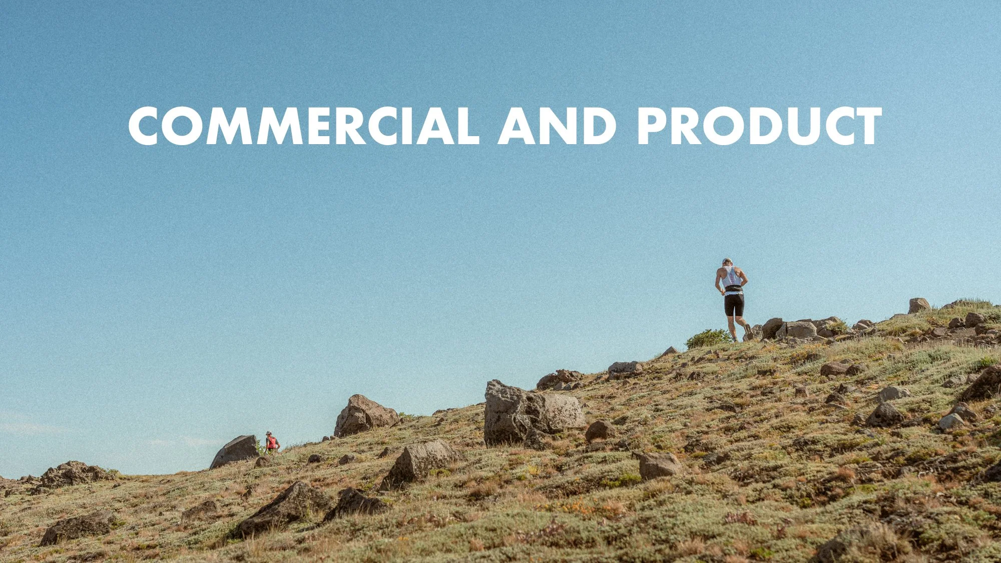 A person hiking up a rocky hillside with a blue sky background, with the text 'Commercial and Product' overlayed at the top.