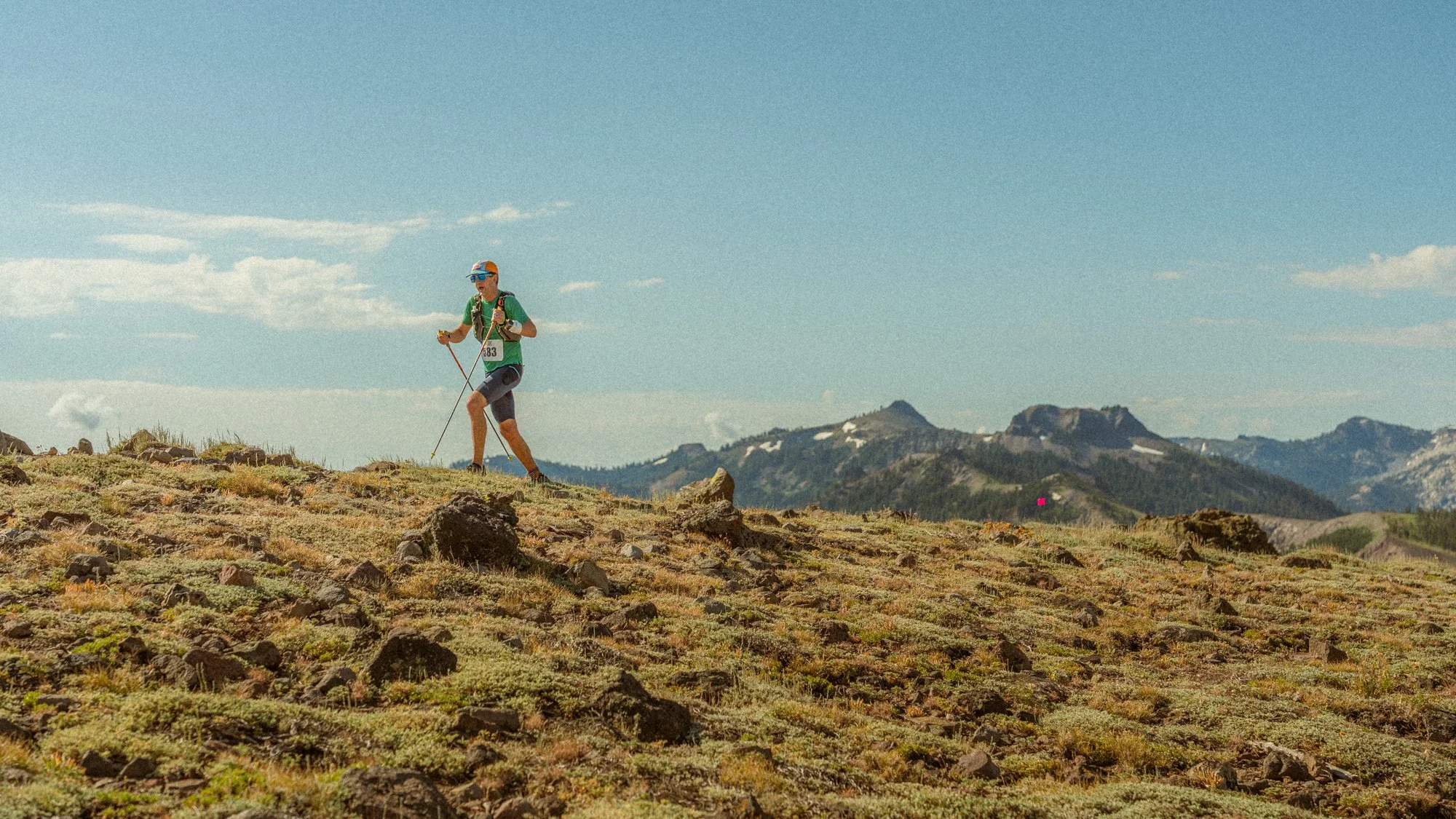 A male mountain trail runner traverses a rocky hillside with mountains in the background under a blue sky with scattered clouds.