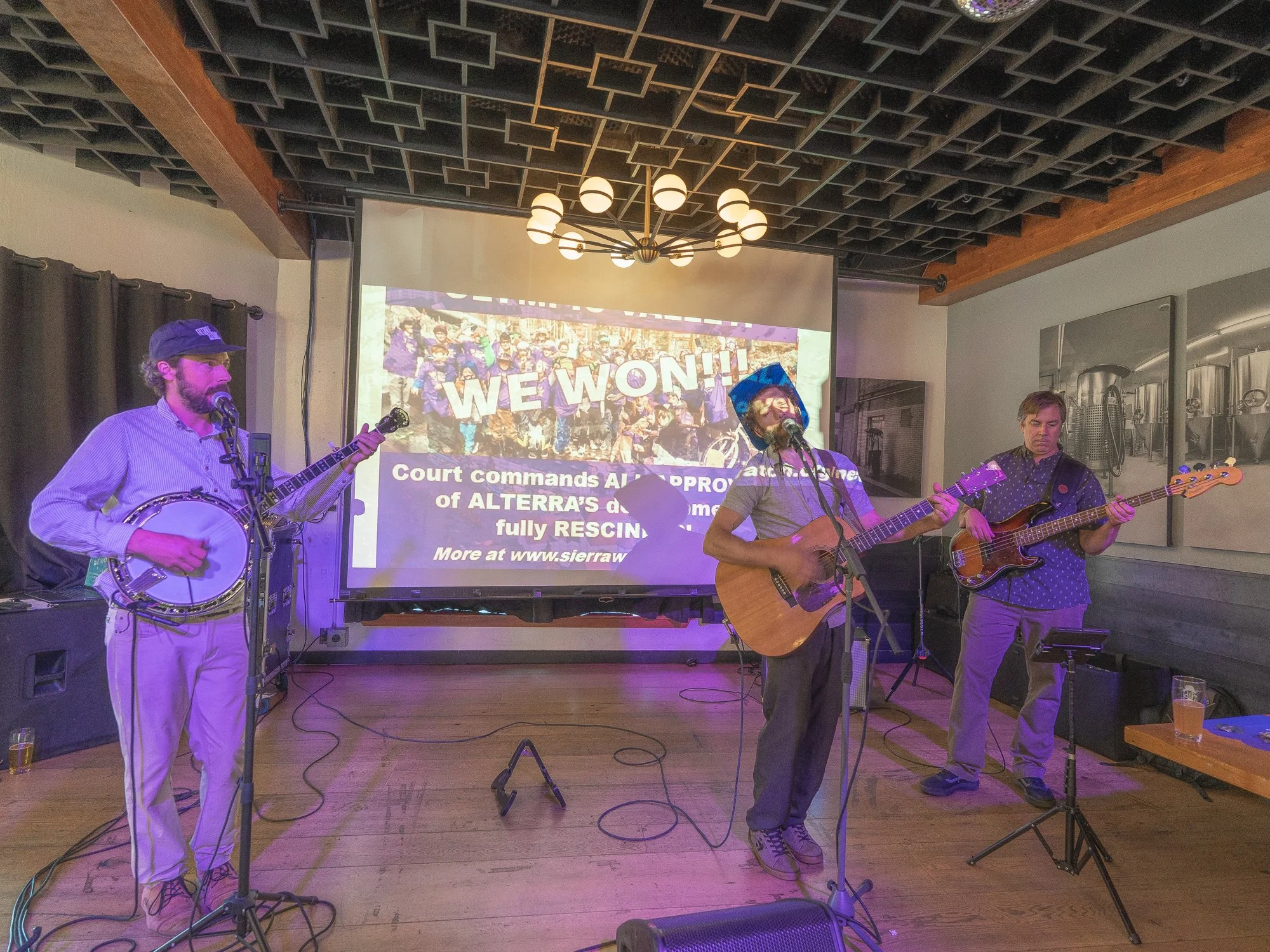 Three musicians performing with guitars and a banjo in a room with a large projected screen showing a celebration with the words 'WE WON!!!' and a background of people. The room has a black decorative ceiling, wooden floor, and black and white photo