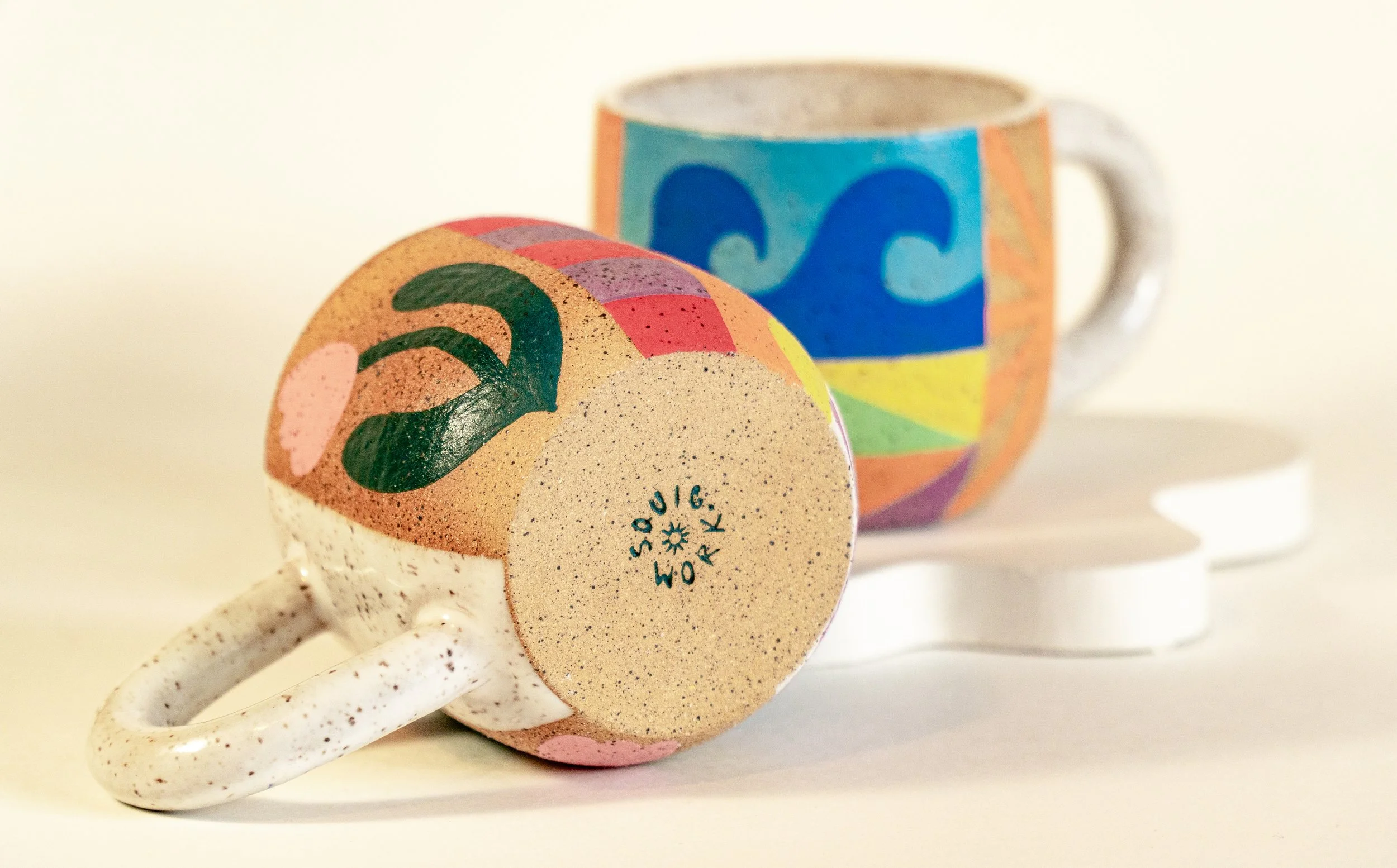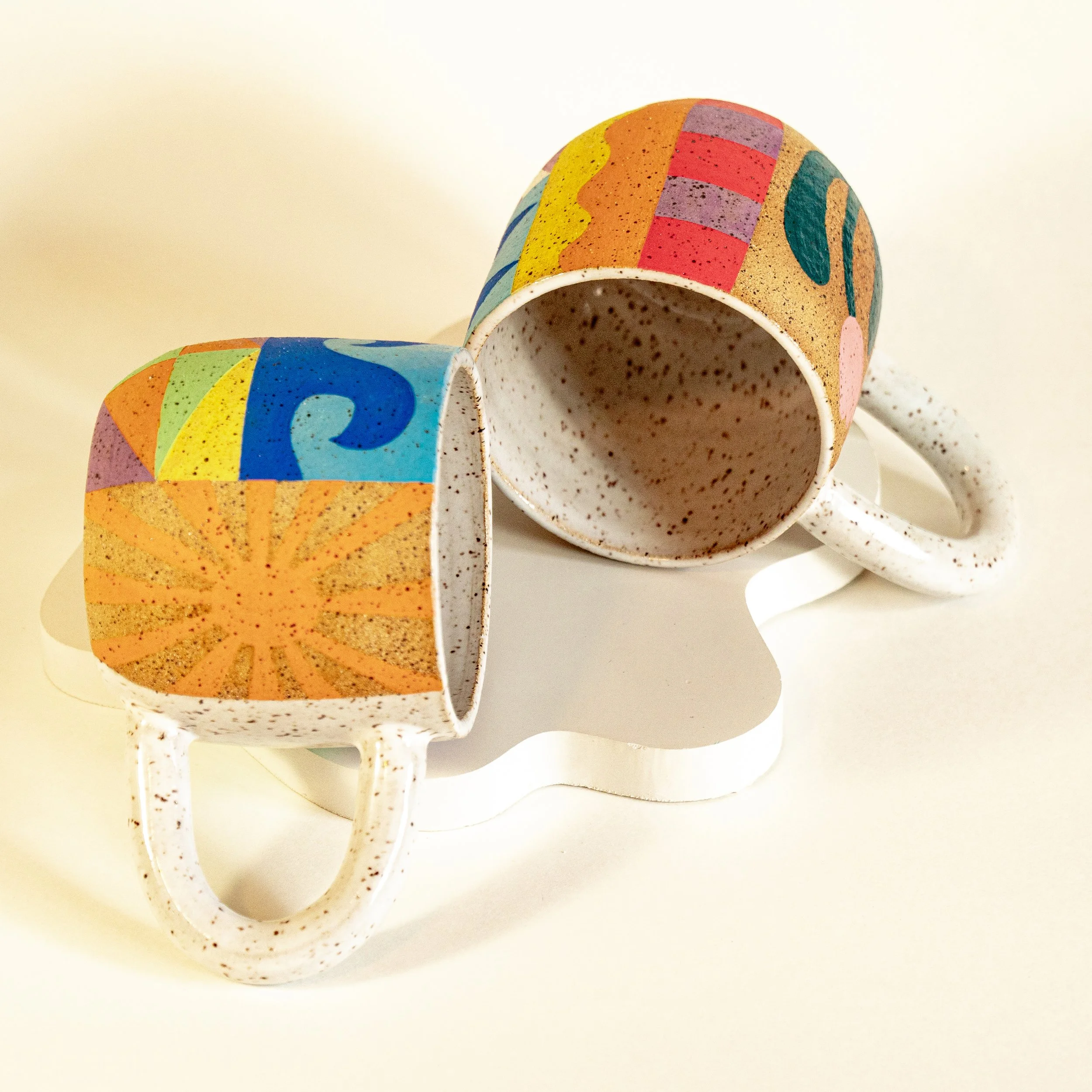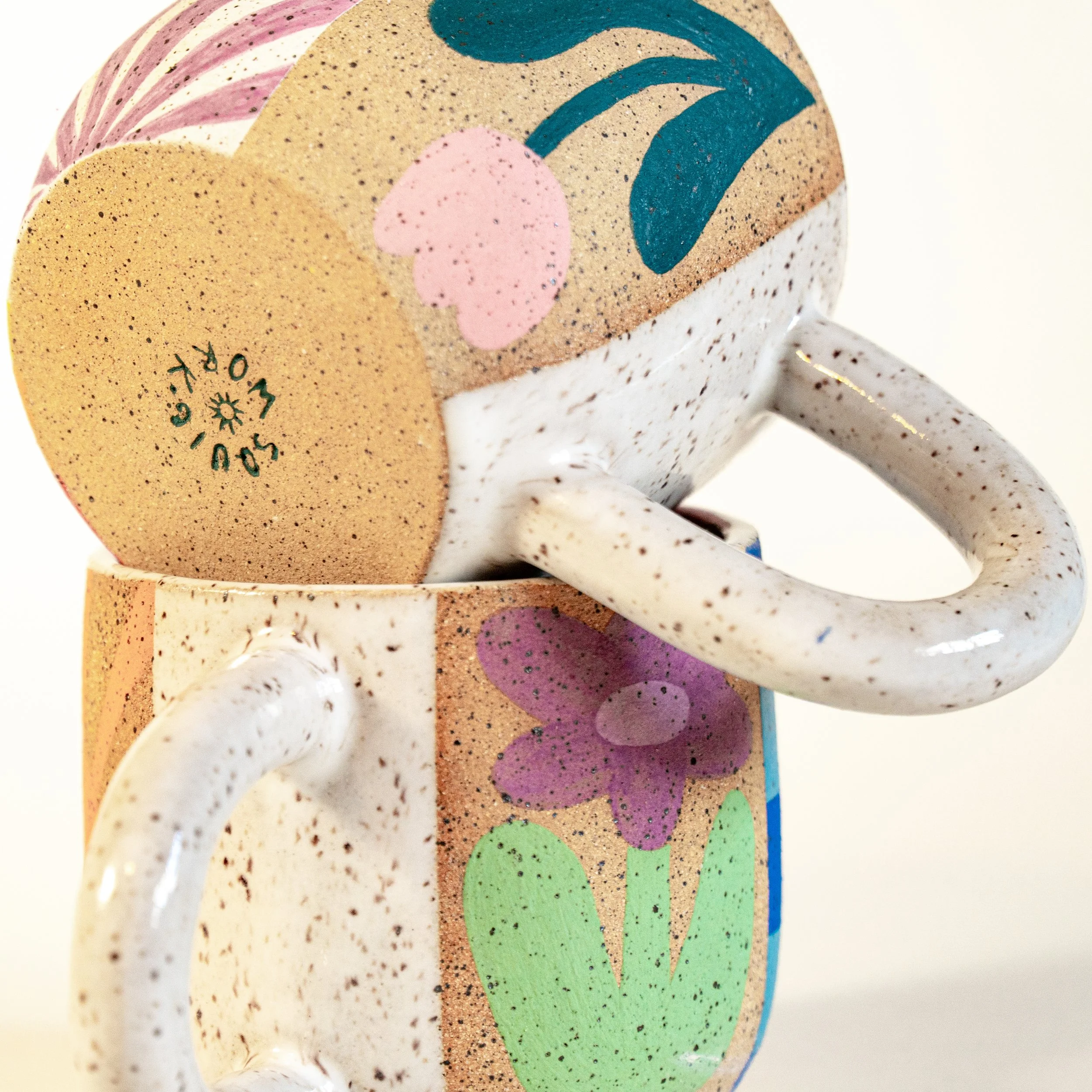 Two stacked ceramic mugs with colorful floral and abstract designs, speckled surface, and curved handles.