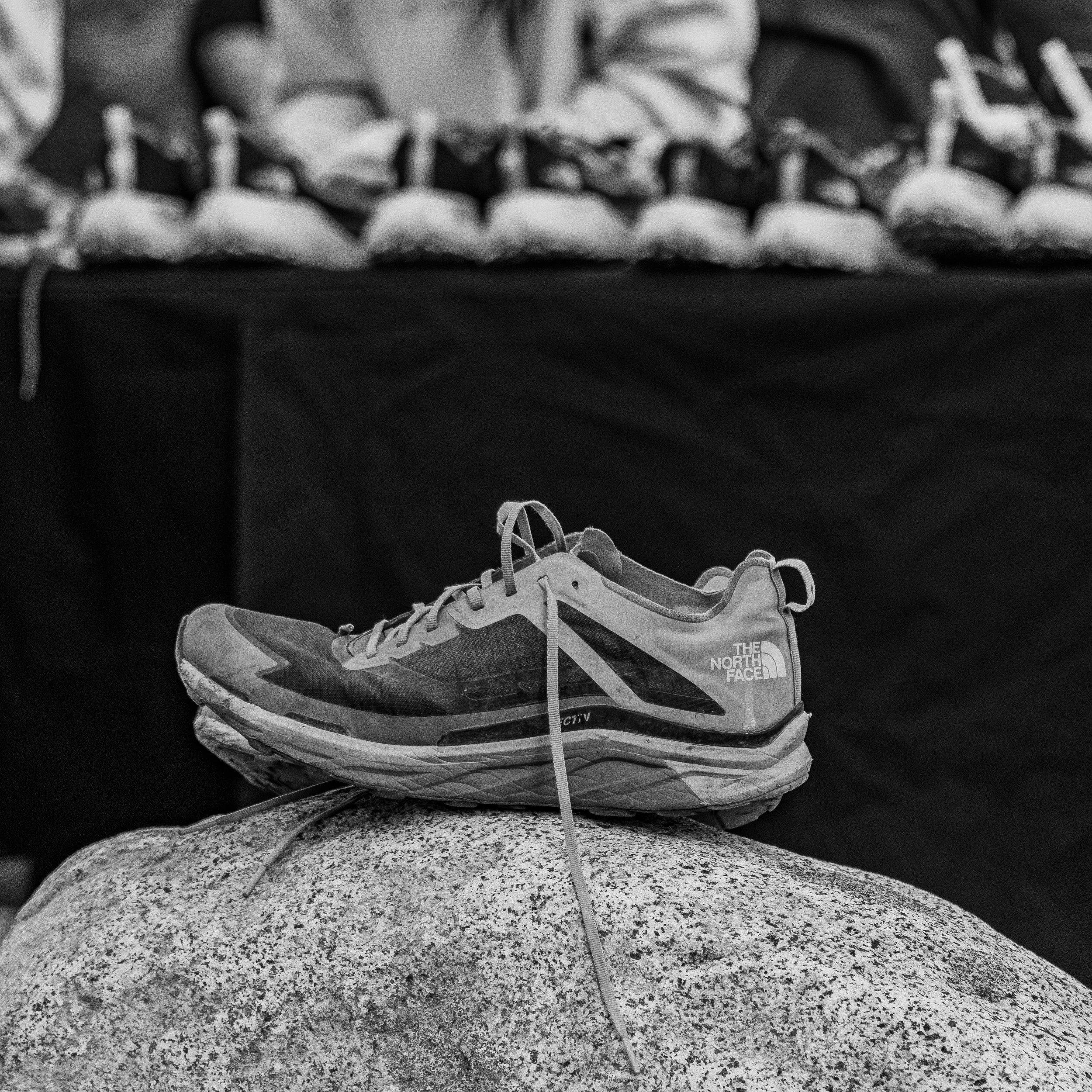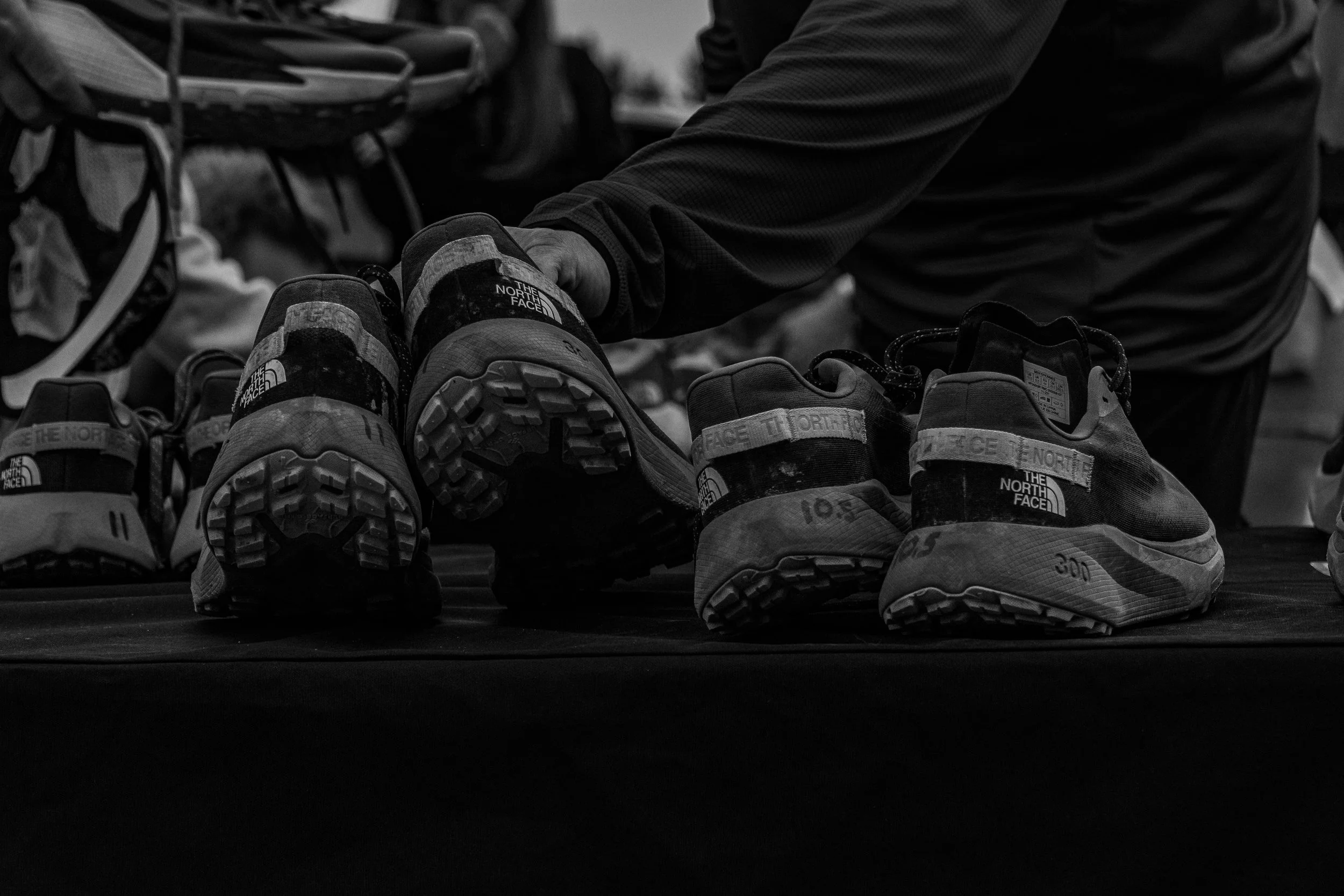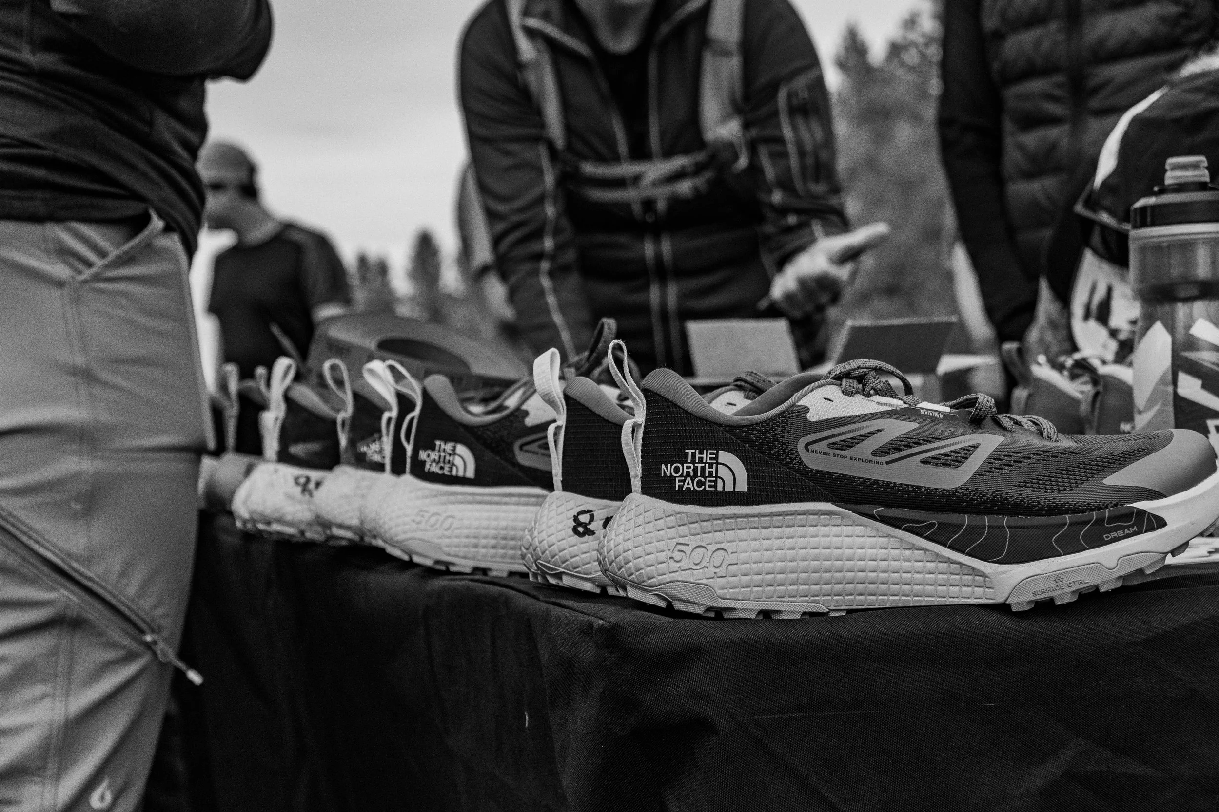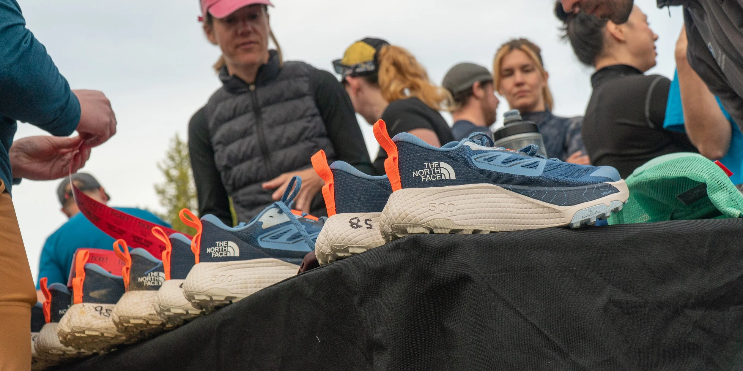 A row of The North Face running shoes displayed on a table at an outdoor event, with people in jackets and backpacks in the background.