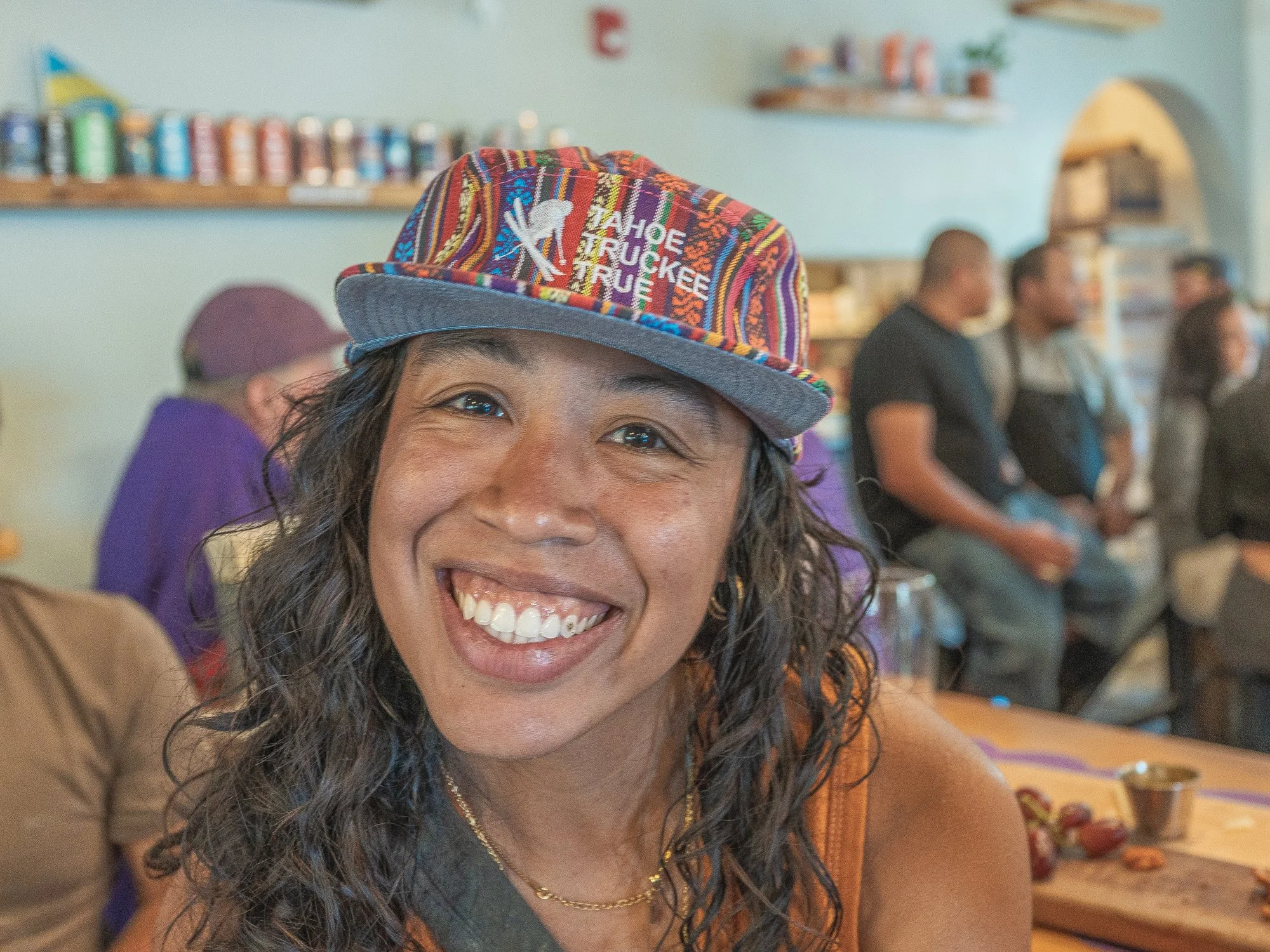 A woman with curly hair smiling, wearing a colorful, patterned hat with the words "Tahoe Truckee True" embroidered on it, in a lively indoor setting with people sitting in the background.