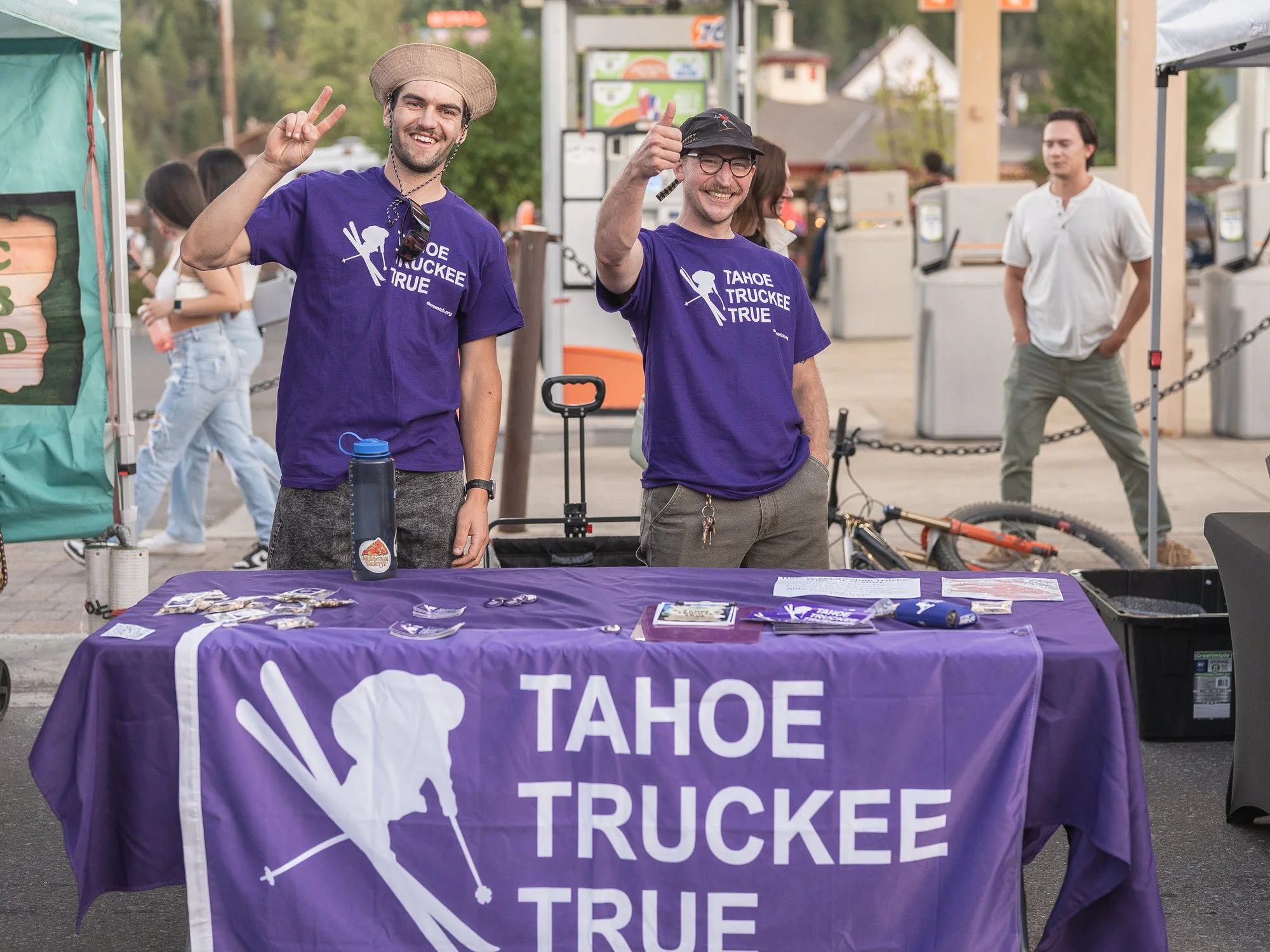 Two men in purple shirts with 'Tahoe Truckee True' logo standing behind a table with promotional materials at an outdoor event. One man is making a peace sign, and the other is giving a thumbs-up. There are people and a bicycle in the background.