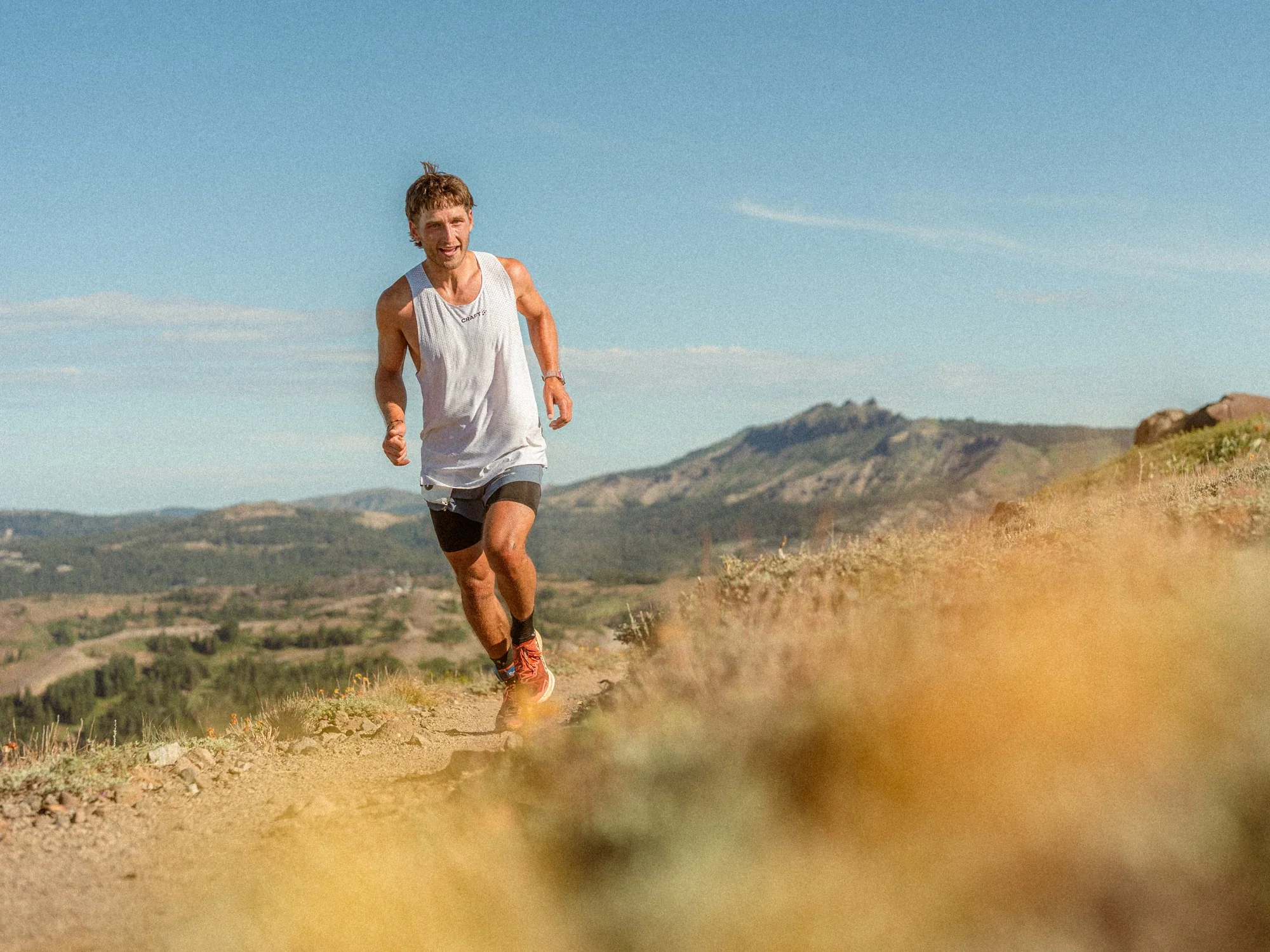A young man running on a dirt trail in a mountainous landscape under a blue sky.