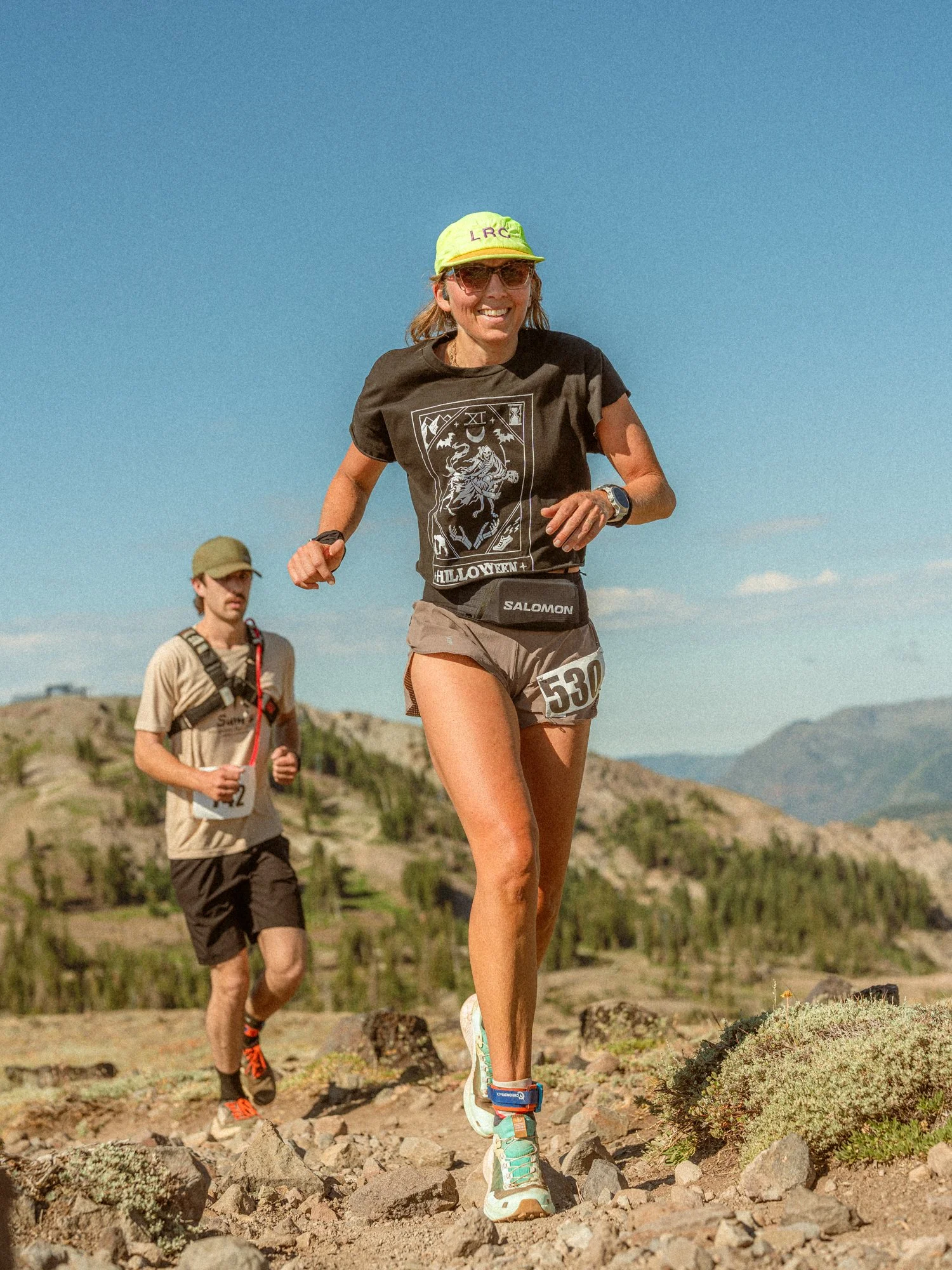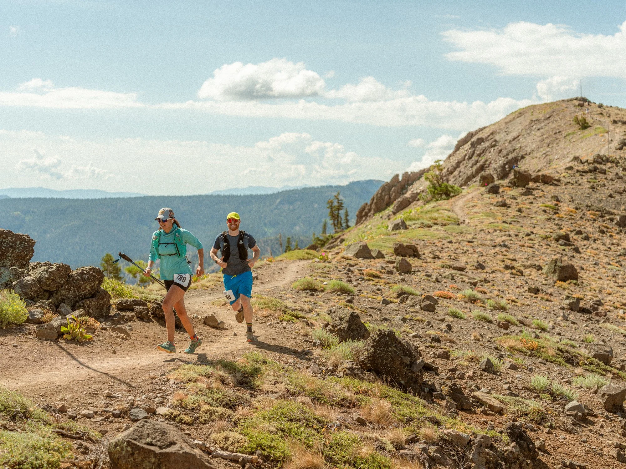 Two trail runners, a woman and a man, running along a rocky mountain trail with scenic mountain views and partly cloudy sky in the background.
