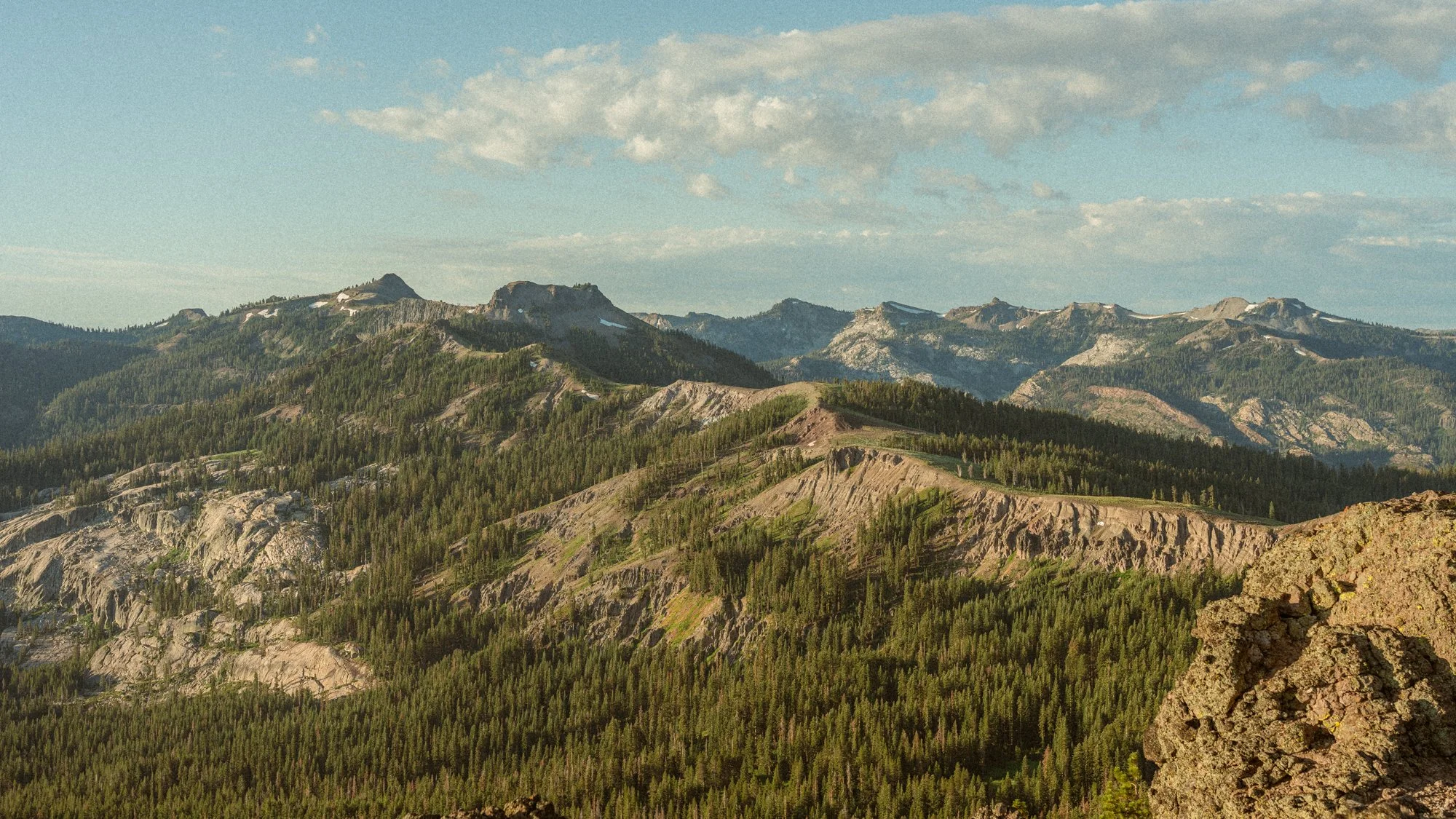 Mountain landscape with forested slopes, ridges, and distant peaks under a partly cloudy sky.