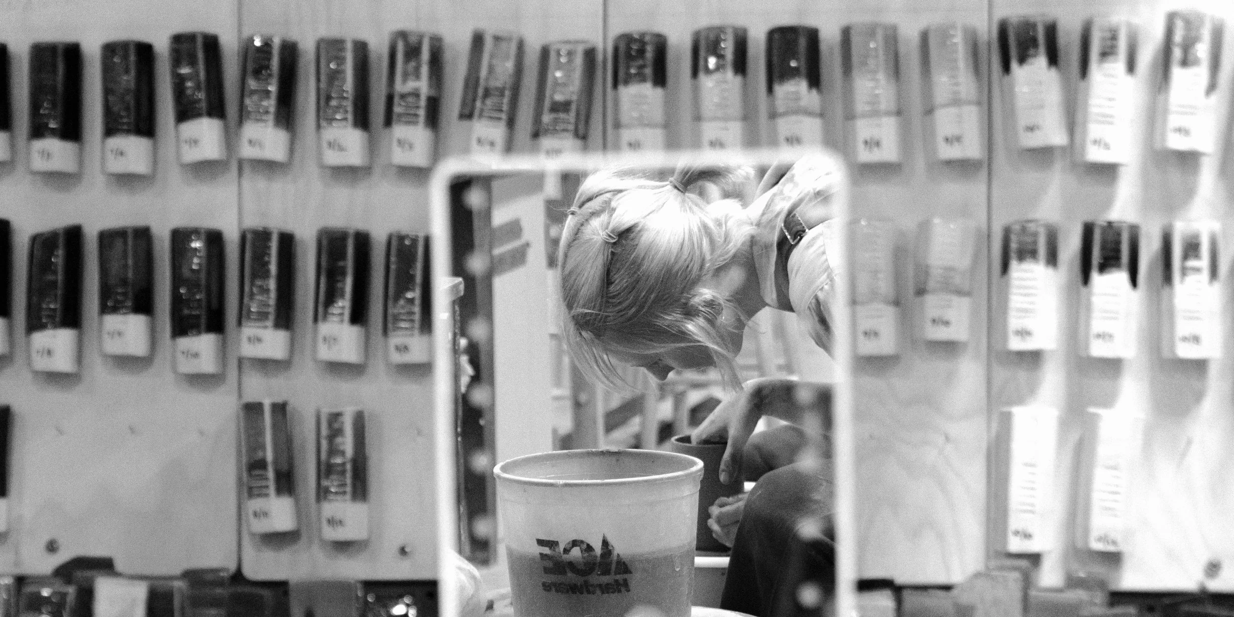 A person working on a pottery wheel with a ceramic piece in progress, surrounded by shelves in a workshop.