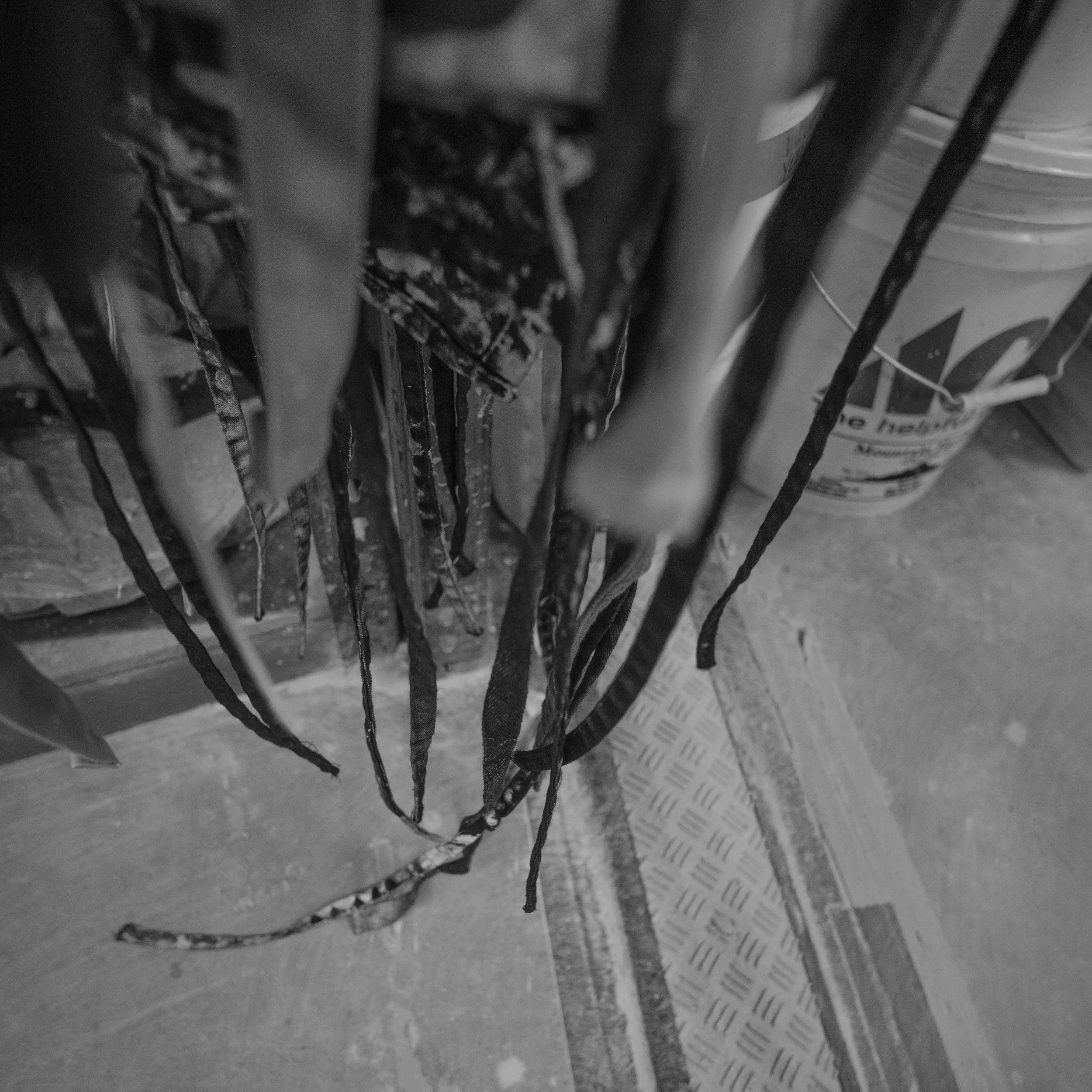 Black and white photo of a cluttered storage space with various items hanging on a wire rack, including fabric, paper, and a large container in the background, on a concrete floor.