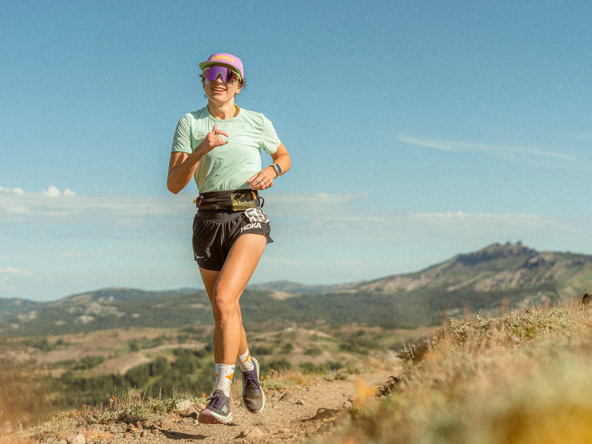 A woman running outdoors on a trail with mountains and blue sky in the background.