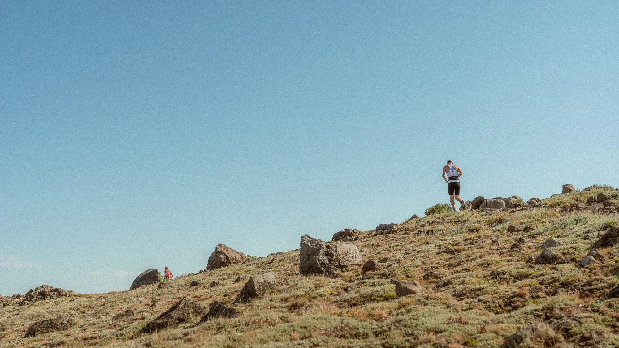 Two runners wearing bibs participate in a trail race on a rocky hillside with sparse vegetation and tall, leafless trees under a partly cloudy sky.