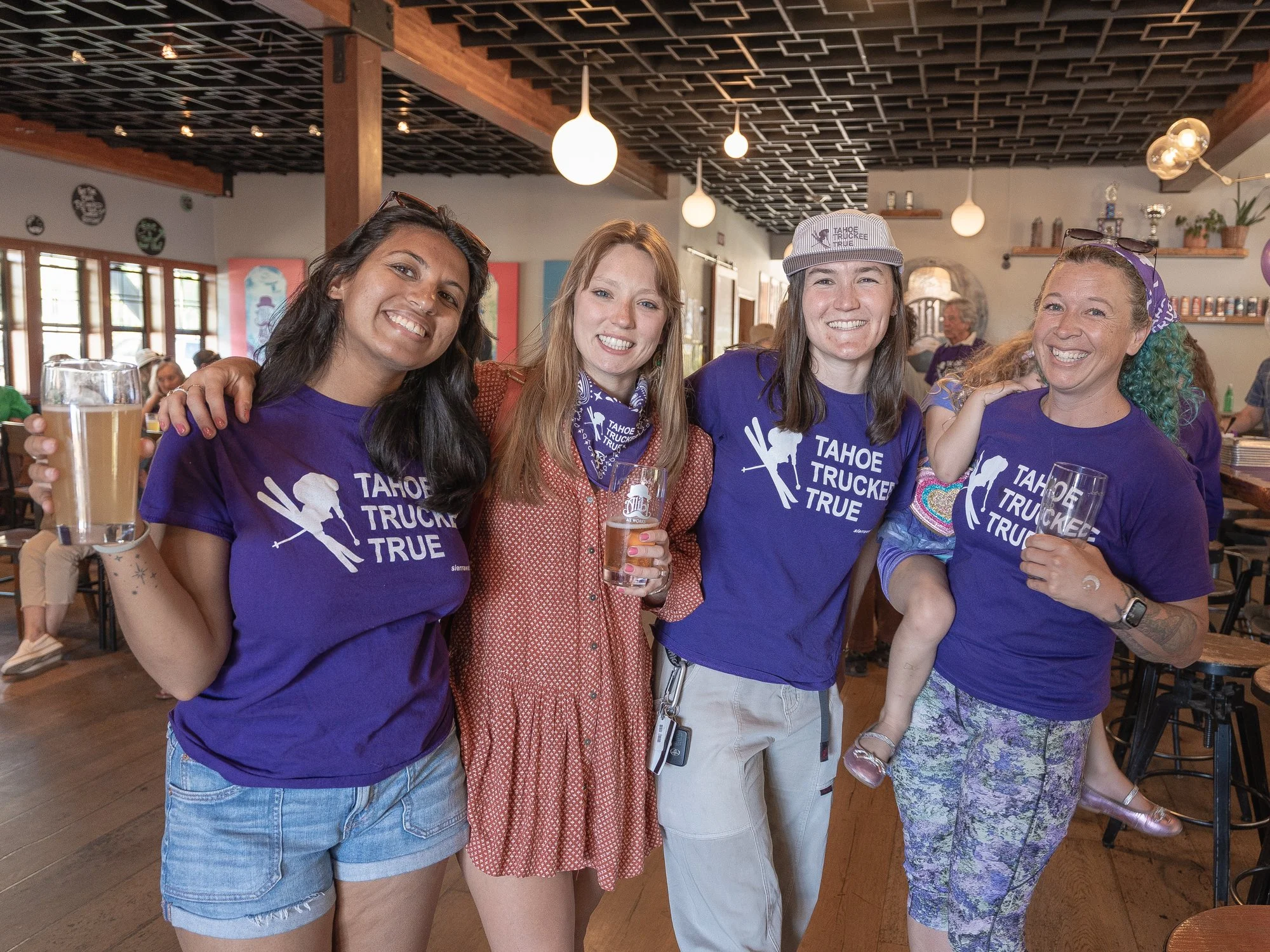 Four women and one young girl smiling in a restaurant, wearing purple T-shirts with the text "Tahoe Trucker True," holding drinks, with a wooden ceiling and decor in the background.