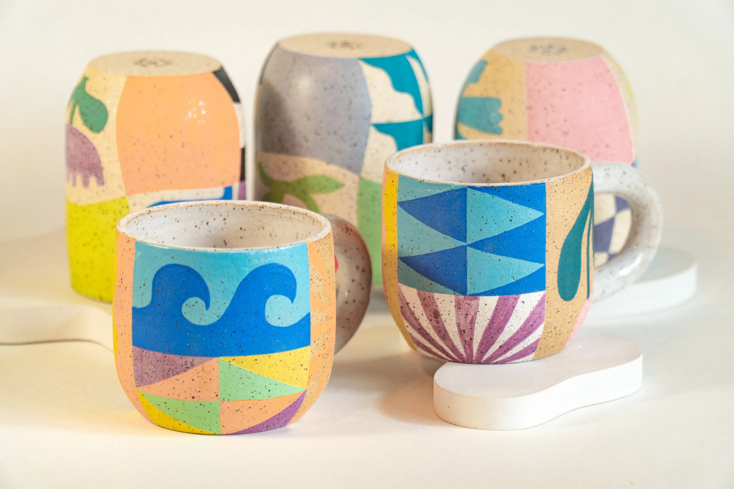 Six colorful ceramic cups with abstract and geometric patterns, displayed on a white surface. Some cups are placed on white stands.